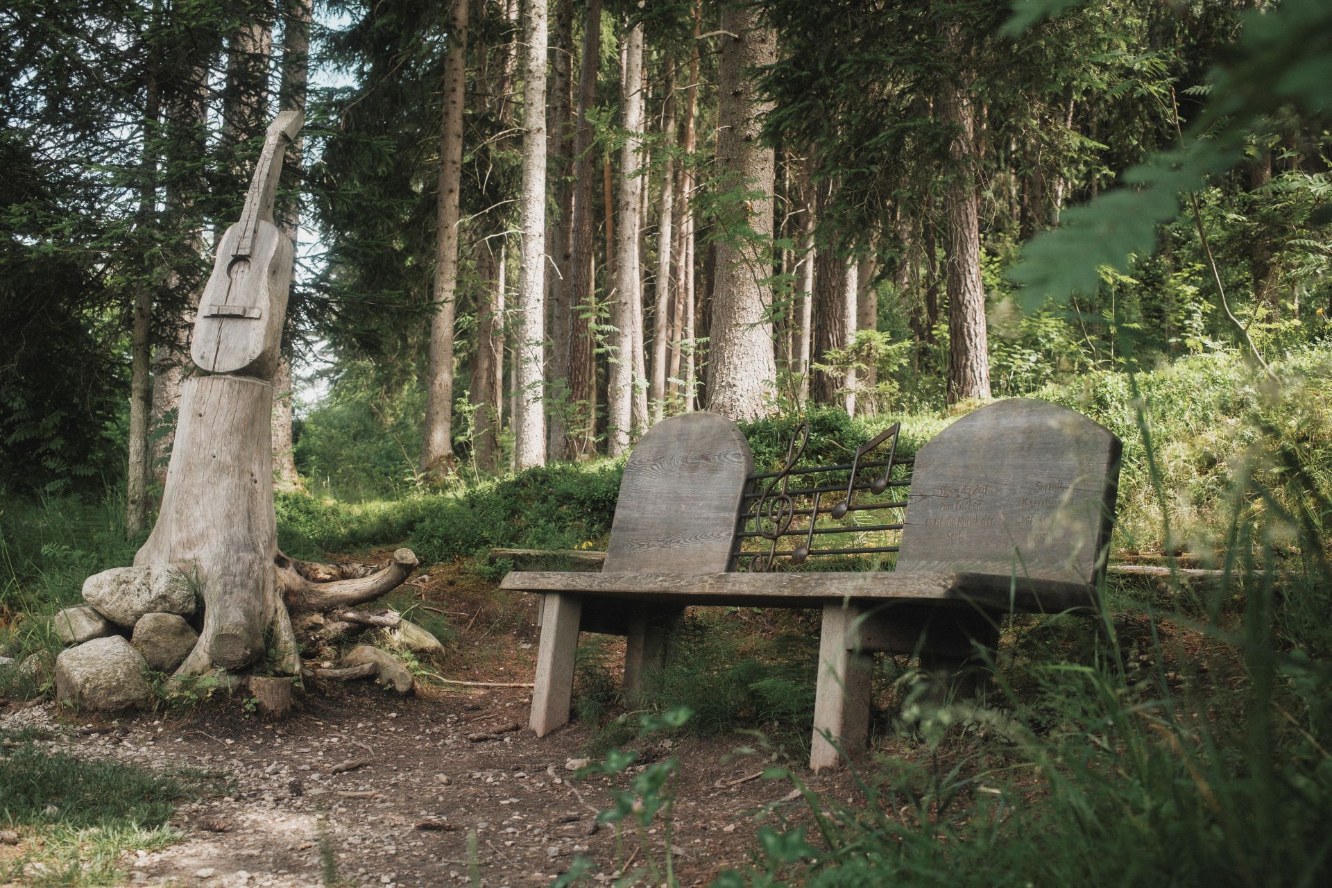 Ein malerischer Rundweg durch blühende Wiesen und schattige Wälder, der mit handgefertigten Lärchenholz-Bänken und atemberaubenden Ausblicken aufwartet.